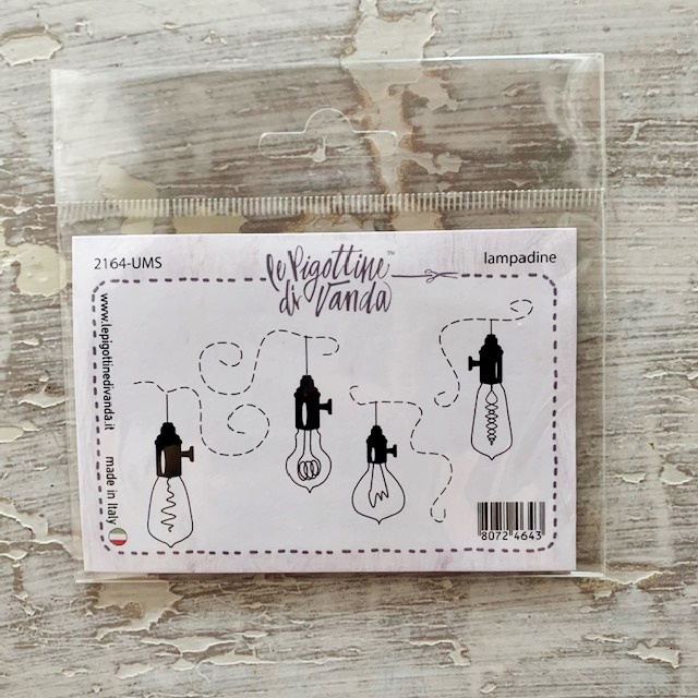 Timbro ufficiale Le Pigottine di Vanda per la decorazione di stoffa, carta, legno e tessuti, comprende 4 immagini di lampadine differenti.